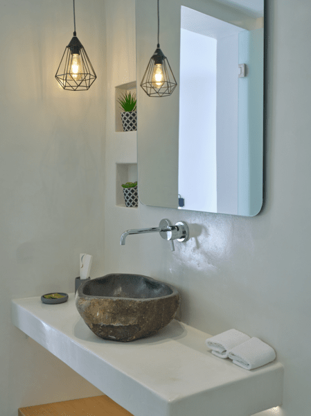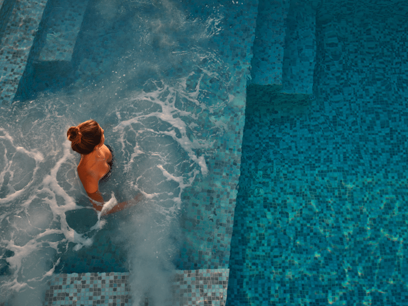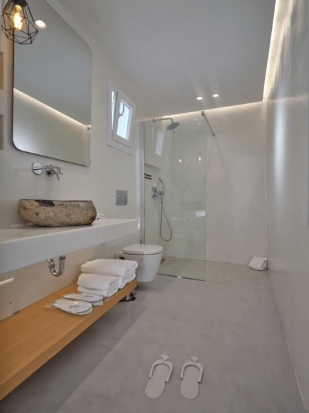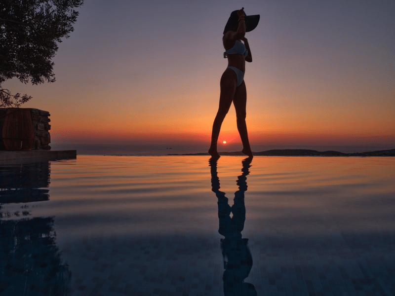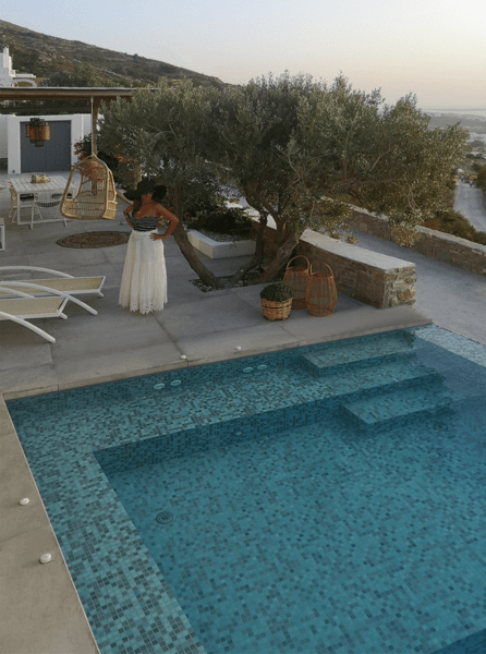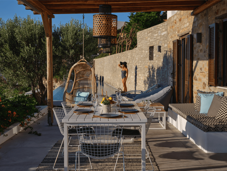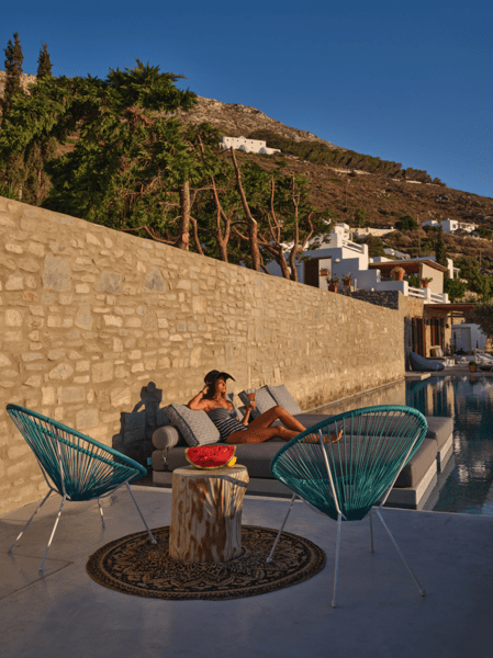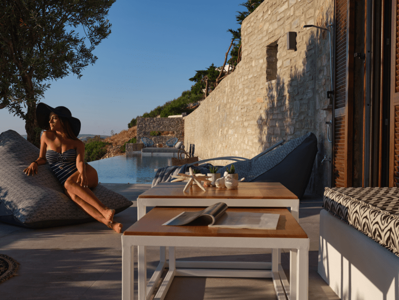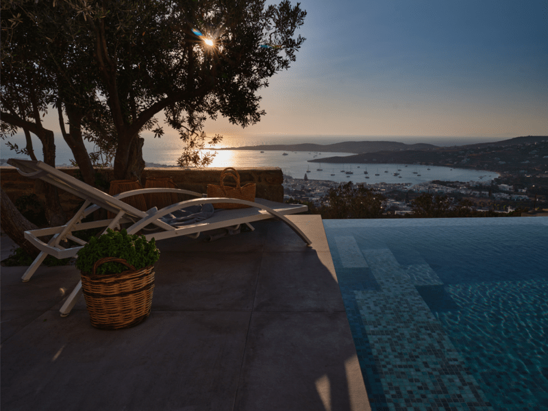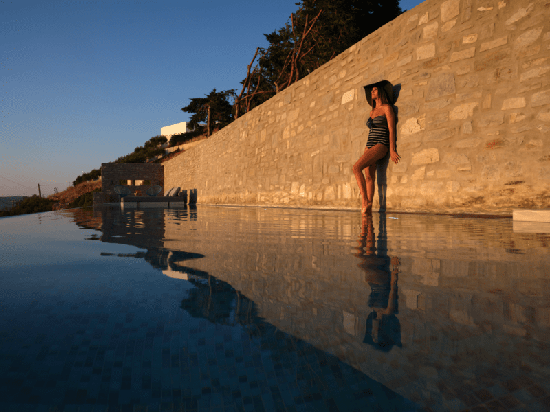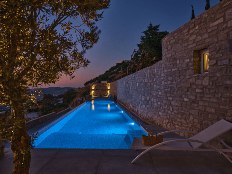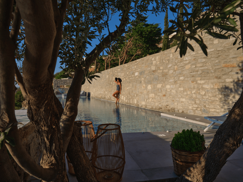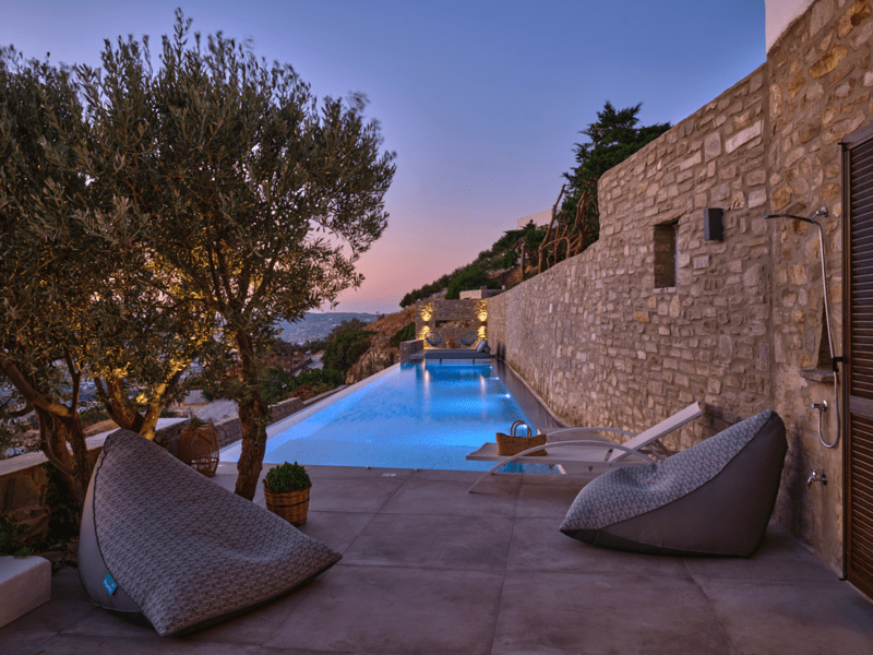 Μια ιδιωτική πισίνα υπερχείλισης 60 τ. μ. με Jacuzzi σε μια γωνία και ξαπλώστρες θα σας προσφέρουν χαλάρωση και μασάζ ταυτόχρονα. Νιώστε την αύρα του Αιγαίου μπροστά στα μάτια σας και κάτω από τα πόδια σας.