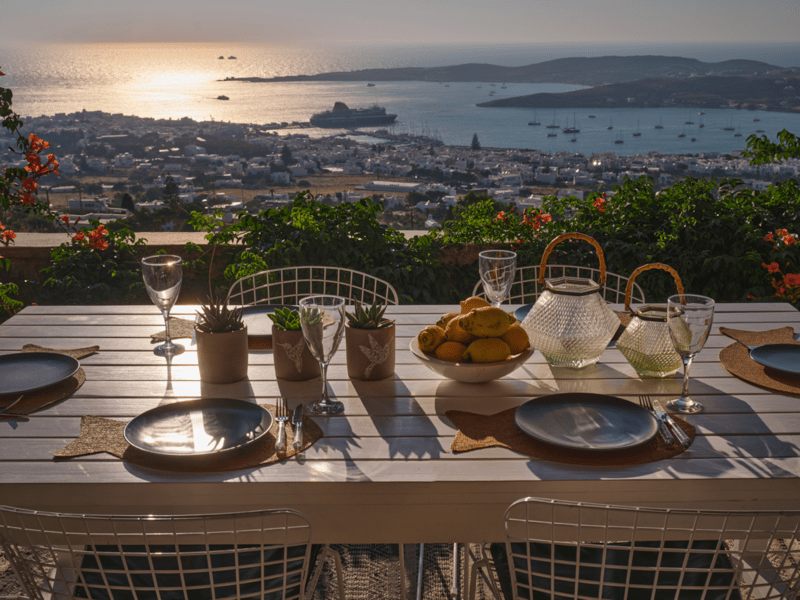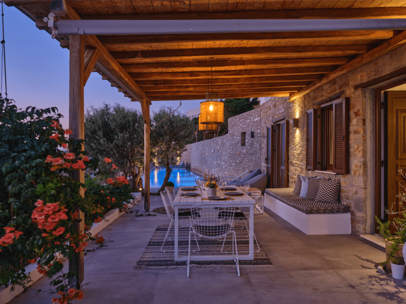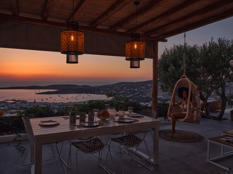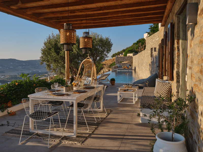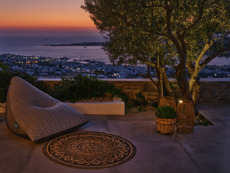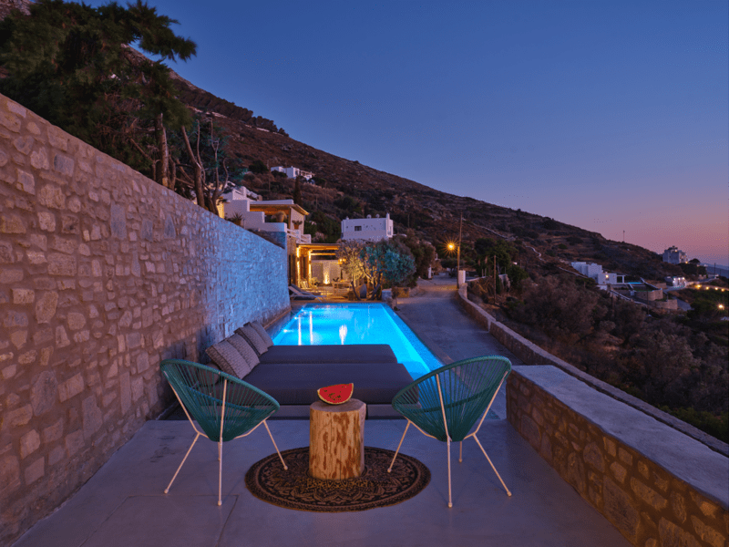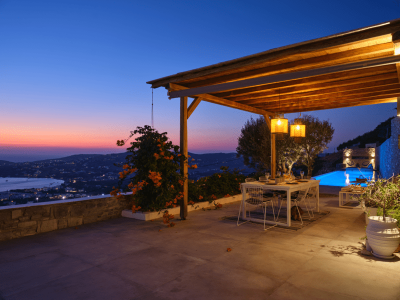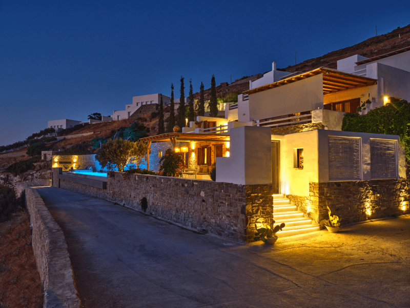 Είναι μέρος ενός μικρού συγκροτήματος από 3 ιδιωτικές βίλες, σε βολική τοποθεσία σε έναν γραφικό υπαίθριο λόφο, 2 χλμ. από το λιμάνι της Παροικιάς και το κέντρο της πόλης, 2,5 χλμ. από την παραλία Λιβάδια και 12 χλμ. από το αεροδρόμιο.